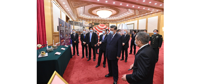 人民大会堂北大厅气氛喜庆热烈。上午10时许,习近平等党和国家领导同志步入会场,向参研参试人员代表挥手致意,全场响起经久不息的掌声。习近平同孙家栋、栾恩杰等亲切交流,并同大家合影留念。
